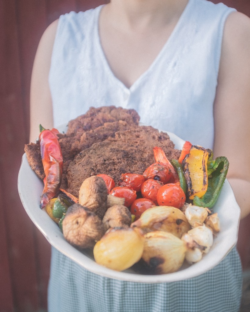 I grilled some veggies (3 different color of bell pepper, chili, mushrooms, garlic, onion,and cherry tomatoes ) with the seitan to add more color and flavour, brushed the same oil and spices
